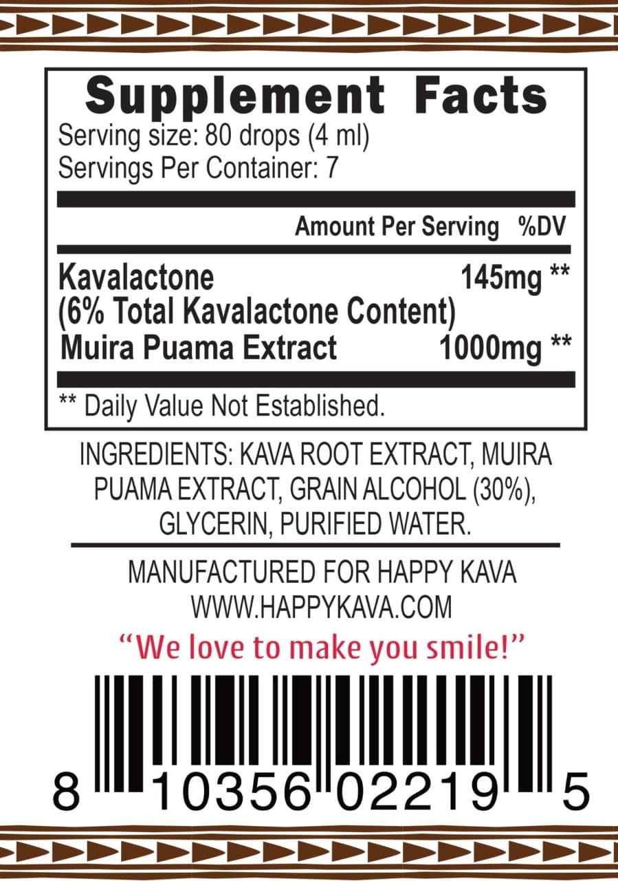 *These statements have not been evaluated by the Food and Drug Administration. This Happy Kava Brand Muira Puama Kava Tincture Blend is not intended to cure, treat, diagnose, or prevent any disease.