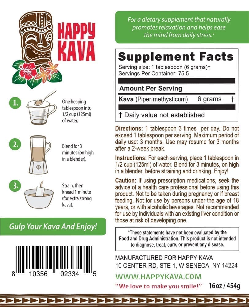 Caution: If using prescription medications, seek the advice of a health care professional before using this product. Not to be taken during pregnancy or if breastfeeding. Not for use by persons under the age of 18 years or with alcoholic beverages. Keep out of reach of children. Used in excess or with substances that induce drowsiness, the ability to operate heavy equipment or a vehicle may be impaired. US FDA advises that although it appears to be rare, a potential risk of liver injury may be associated with kava-containing dietary supplements.